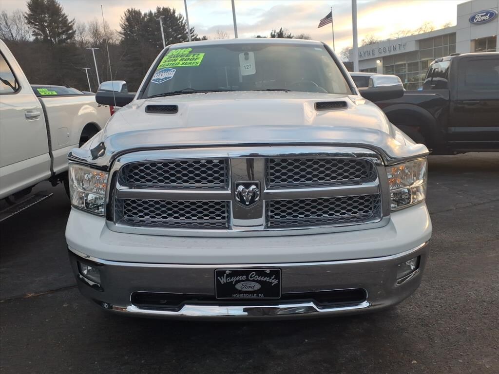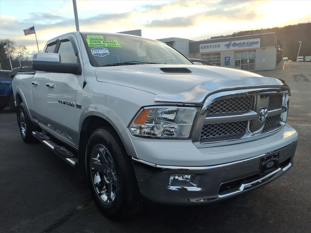 WAYNE COUNTY FORD WE MAKE THE DIFFERENCE. CLEAN AUTO CHECK, SERVICED AND READY TO DRIVE HOME, LOCAL TRADE IN, NEW TO THE LOT THIS ONE WONT LAST, RARE FIND, WORK HARD PLAY HARDER, 4WD/AWD, 19 HWY MPG, 1500 Laramie, 4D Quad Cab, HEMI 5.7L V8 Multi Displacement VVT, 6-Speed Automatic, 4WD, Bright White Clearcoat, Light Pebble Beige/Bark Brown Leather, Navigation System, Power Sunroof, Quick Order Package 25H Laramie. Bright White Clearcoat 2012 Ram 1500 Laramie 4WD 6-Speed Automatic HEMI 5.7L V8 Multi Displacement VVT Recent Arrival! Awards: * 2012 KBB.com 10 Best Used Trucks Under $20,000 Reviews: * If you need a pickup truck that is as tough as the rugged image it portrays, but you'd also like something with a civilized ride and a nice interior to double as the family road-trip machine, the 2012 Ram 1500 pickup up makes a nice compromise. And, the Hemi badge on the side is sure to impress your buddies. Source: KBB.com * Best-in-class ride quality; well-made interior; clever storage spaces; powerful V8; lots of interior space. Source: Edmunds YOU CAN BUY FROM ANYPLACE WHY NOT BUY FROM THE PLACE THAT CARES ABOUT YOU.